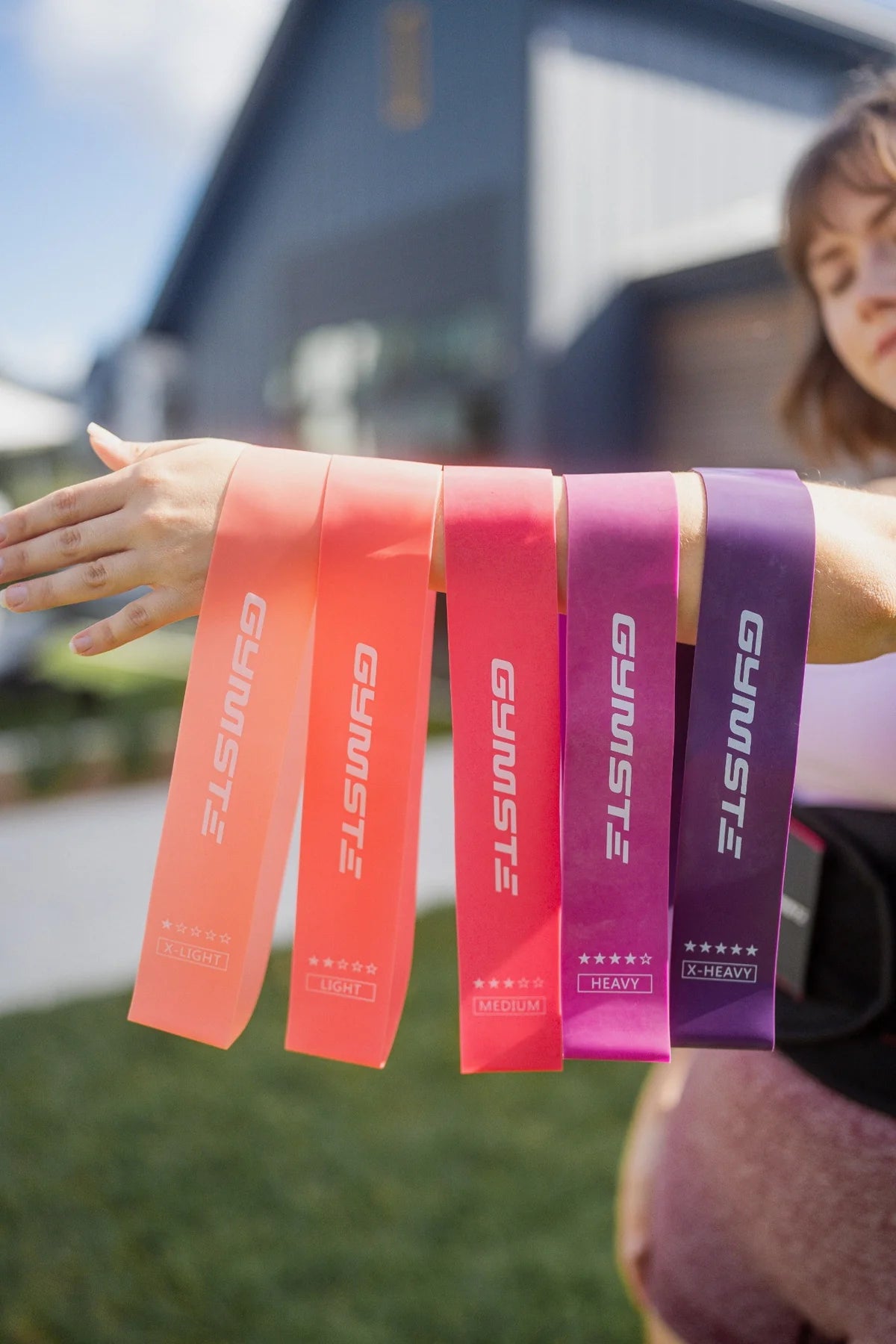Includes 5 loop resistance bands in graded weights: X-Light, Light, Medium, Heavy, X-Heavy. Build strength progressively, warm up safely, and target glutes, legs, arms, and core with a compact, durable set.