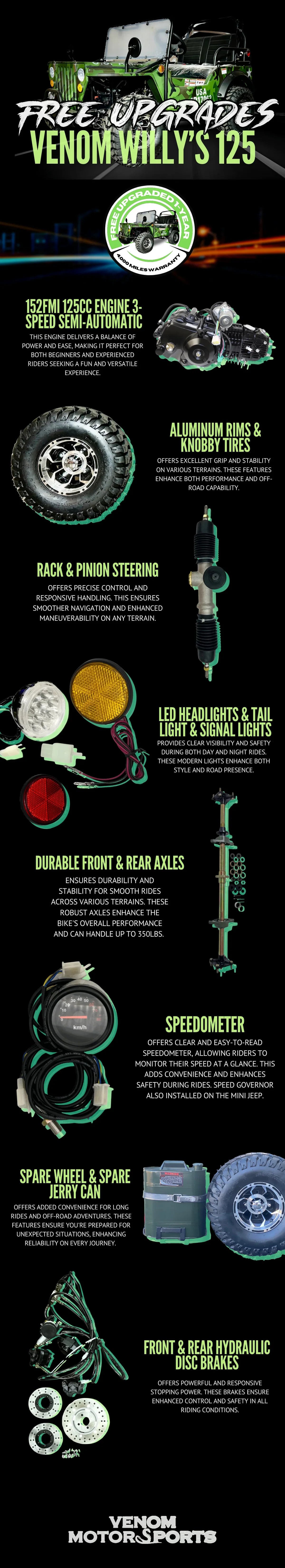 This 125cc Mini Jeep is engineered for smooth acceleration and controlled handling across dirt, sand, or grass.